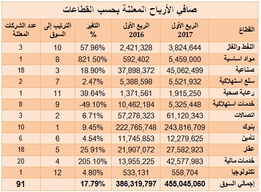 كما أدى عزوف قطاع كبير من المتداولين في البورصة نتيجة تأخر العديد من الشركات المدرجة في الإفصاح عن بياناتها المالية الفصلية إلى تراجع معدلات التداول وحضور حالة من الحذر في التعاملات وانخفاض الرغبة في الشراء، مما أضاف عامل ضغط آخر على أداء البورصة بشكل عام. هذا ومع نهاية الأسبوع الماضي وصل عدد الشركات التي أعلنت عن نتائج الربع الأول من العام الجاري إلى 90 شركة فقط، وذلك من أصل 177 شركة مدرجة في السوق الرسمي، أي أن حوالي نصف عدد الشركات المدرجة لم يعلن بعد عن نتائجه، وذلك على الرغم من أن المهلة القانونية المحددة للإفصاح شارفت على الانتهاء، إذ ستنتهي في الخامس عشر من الشهر الجاري. وقد حققت الشركات المعلنة ما يقرب من 455.03 مليون دينار كويتي أرباحاً صافية، بارتفاع نسبته 17.90% عن أرباح نفس الشركات لذات الفترة من العام 2016، حيث بلغت 385.95 مليون دينار كويتي. وفيما يلي جدول يبين صافي أرباح الشركات المدرجة في البورصة بحسب القطاعات: