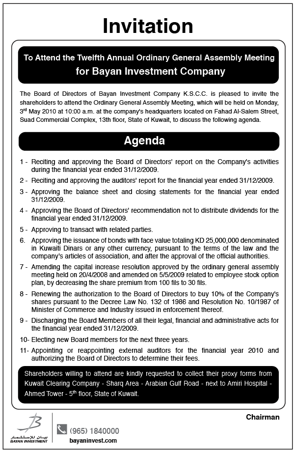 Adv: Invitation for the Twelfth Annual Ordinary General Assembly Meeting.