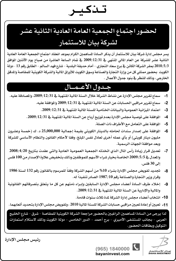 تذكير بموعد إنعقاد إجتماع الجمعية العامة العادية الثانية عشر