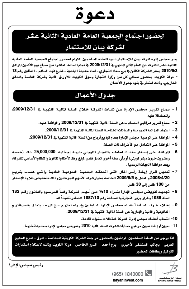 دعوة لحضور اجتماع الجمعية العامة العادية الثانية عشر لشركة بيان للإستثمار