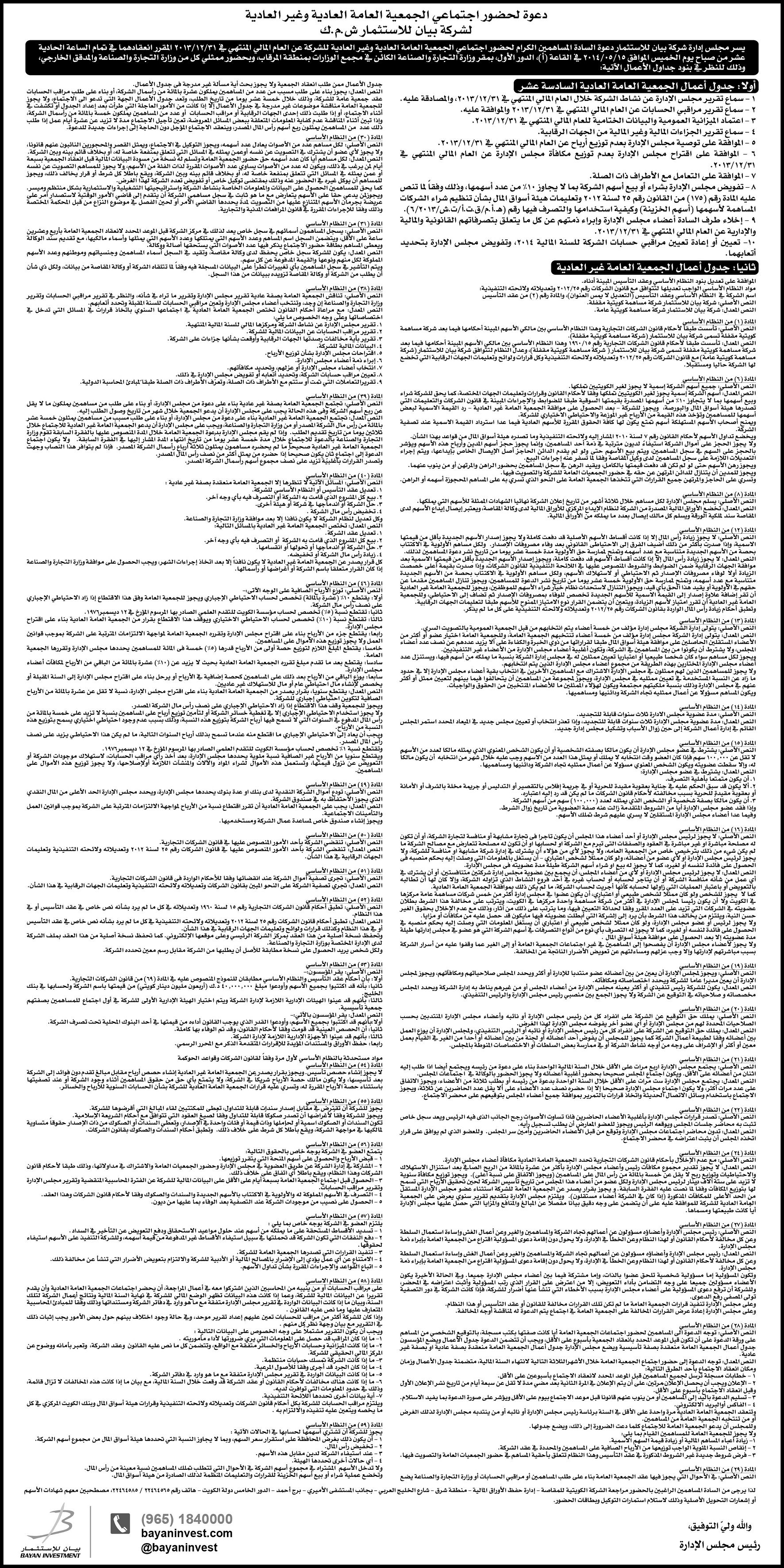 إعلان: دعوة لحضور إجتماعي الجمعية العامة العادية و غير العادية