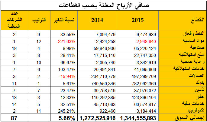 وعلى صعيد متصل، وصل عدد الشركات التي أعلنت عن نتائجها المالية لعام 2015 إلى نحو 87 شركة فقط، من أصل 189 شركة مدرجة في السوق الرسمي، محققة حوالي 1.34 مليار دينار كويتي، بارتفاع نسبته 5.66% عن نتائج نفس الشركات للعام المالي 2014. هذا وقد شغل قطاع البنوك المركز الأول بين قطاعات السوق من حيث حجم الأرباح المحققة حتى الآن، حيث بلغ إجمالي الأرباح المحققة للقطاع 782.09 مليون دينار كويتي، أي ما نسبته 58.17% من إجمالي الأرباح المحققة للسوق ككل، في حين شغل قطاع الاتصالات المرتبة الثانية بعد أن بلغت أرباح الشركات المدرجة فيه 197.30 مليون دينار كويتي، أي بنسبة بلغت 14.67% من إجمالي أرباح جميع الشركات المعلنة.