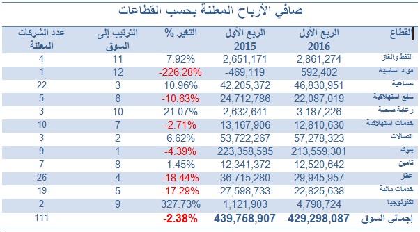 وعلى صعيد نتائج الشركات المدرجة عن فترة الربع الأول من العام الجاري، فقد وصل عدد الشركات التي أعلنت عن نتائجها حتى يوم الخميس الماضي إلى 111 شركة، أي بنسبة 60% تقريباً من إجمالي عدد الشركات المدرجة في السوق الرسمي البالغ 186 شركة؛ هذا وقد بلغ إجمالي الأرباح التي سجلتها الشركات المعلنة ما يقرب من 429.30 مليون دينار كويتي، بانخفاض نسبته 2.38% عن إجمالي أرباح نفس الشركات لذات الفترة من العام الماضي، والتي بلغت آنذاك 439.76 مليون دينار كويتي. وقد بلغ عدد الشركات التي سجلت نمواً في ربحية أسهمها 58 شركة، فيما تراجعت ربحية أسهم 51 شركة مع تكبد 18 شركة لخسائر عن الثلاثة أشهر الأولى من عام 2016. وعلى صعيد قطاعات السوق، وبحسب ما تم الإعلان عنه من نتائج، فقد شغل قطاع البنوك المركز الأول لجهة حجم الأرباح المحققة مقارنة بباقي القطاعات، حيث بلغ إجمالي ما حققه القطاع 213.56 مليون دينار كويتي تقريباً، وجاء ثانياً قطاع الاتصالات بـ57.28 مليون دينار كويتي تقريباً، ثم قطاع الصناعية في المركز الثالث بإجمالي ربح بلغ 46.83 مليون دينار كويتي تقريباً، فيما كان قطاع المواد الأساسية الأقل تحقيقاً للأرباح مقارنة بباقي قطاعات السوق، حيث وصل إجمالي الأرباح التي حققتها شركاته إلى 592.40 ألف دينار كويتي تقريباً.