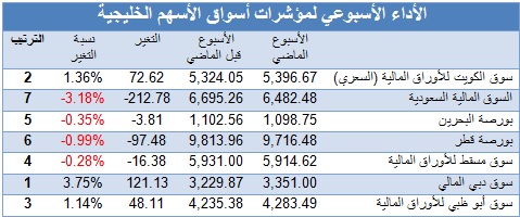 من جهة أخرى، تزامنت المكاسب التي سجلها سوق الكويت للأوراق المالية مع الارتفاعات التي سجلتها بعض الأسواق الخليجية خلال الأسبوع الماضي، إذ شغل السوق الكويتي المرتبة الثانية من حيث نسبة المكاسب الأسبوعية المسجلة بعد أن حقق مؤشره السعري ارتفاعاً نسبته 1.36%، في حين شغل كل من سوق دبي المالي وسوق أبو ظبي للأوراق المالية المرتبة الأولى والثالثة بعد أن نما مؤشريهما بنسبة 3.75% و 1.14% على التوالي. في المقابل، تصدرت السوق المالية السعودي الأسواق التي سجلت خسائر مع نهاية الأسبوع، إذ تراجع مؤشرها بنسبة بلغت 3.18%، تبعتها بورصة قطر التي سجل مؤشرها انخفاضاً نسبته 0.99%، فيما جاءت بورصة البحرين في المرتبة الثالثة بعد أن تراجع تراجع مؤشرها بنسبة بلغت 0.35%، ثم سوق مسقط للأوراق المالية الذي انخفض مؤشرها مع نهاية الأٍبوع بنسبة 0.28%.