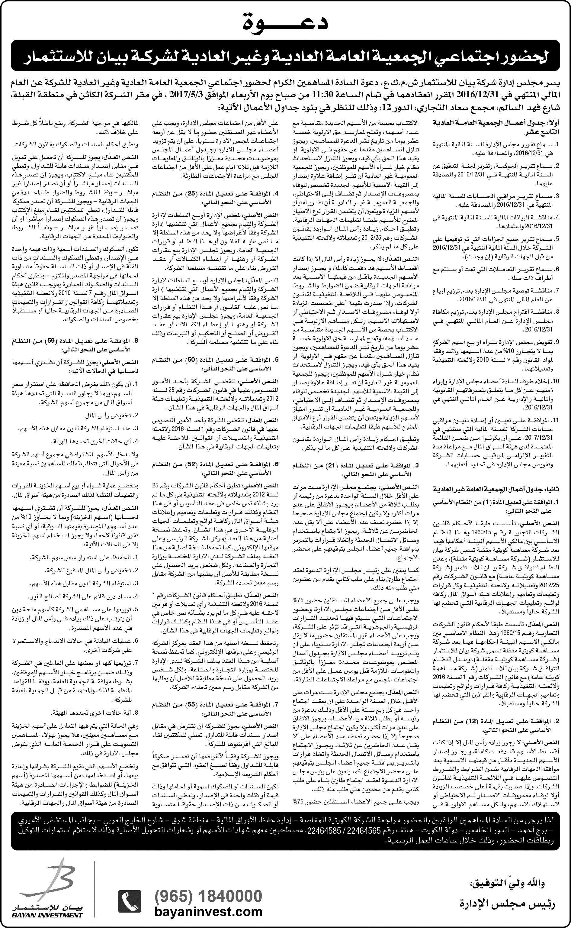 إعلان: دعوة لحضور إجتماعي الجمعية العامة العادية و غير العادية